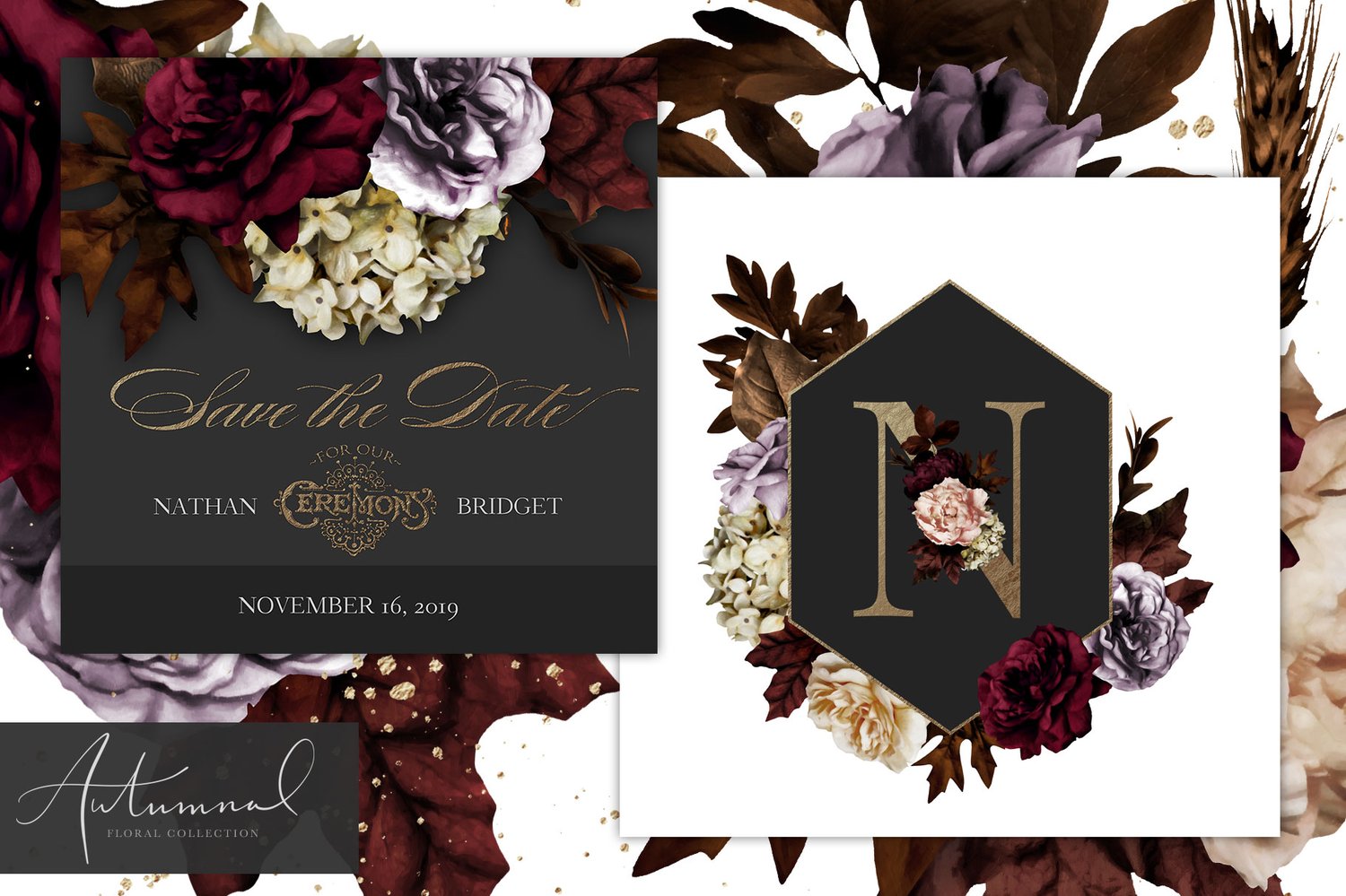 Introducing the new Autumnal Floral Collection featuring stunning flowers in cream, burgundy and lilac as well as autumn leaves. Create lush and moody wedding invitations, stationery, home decor and more.