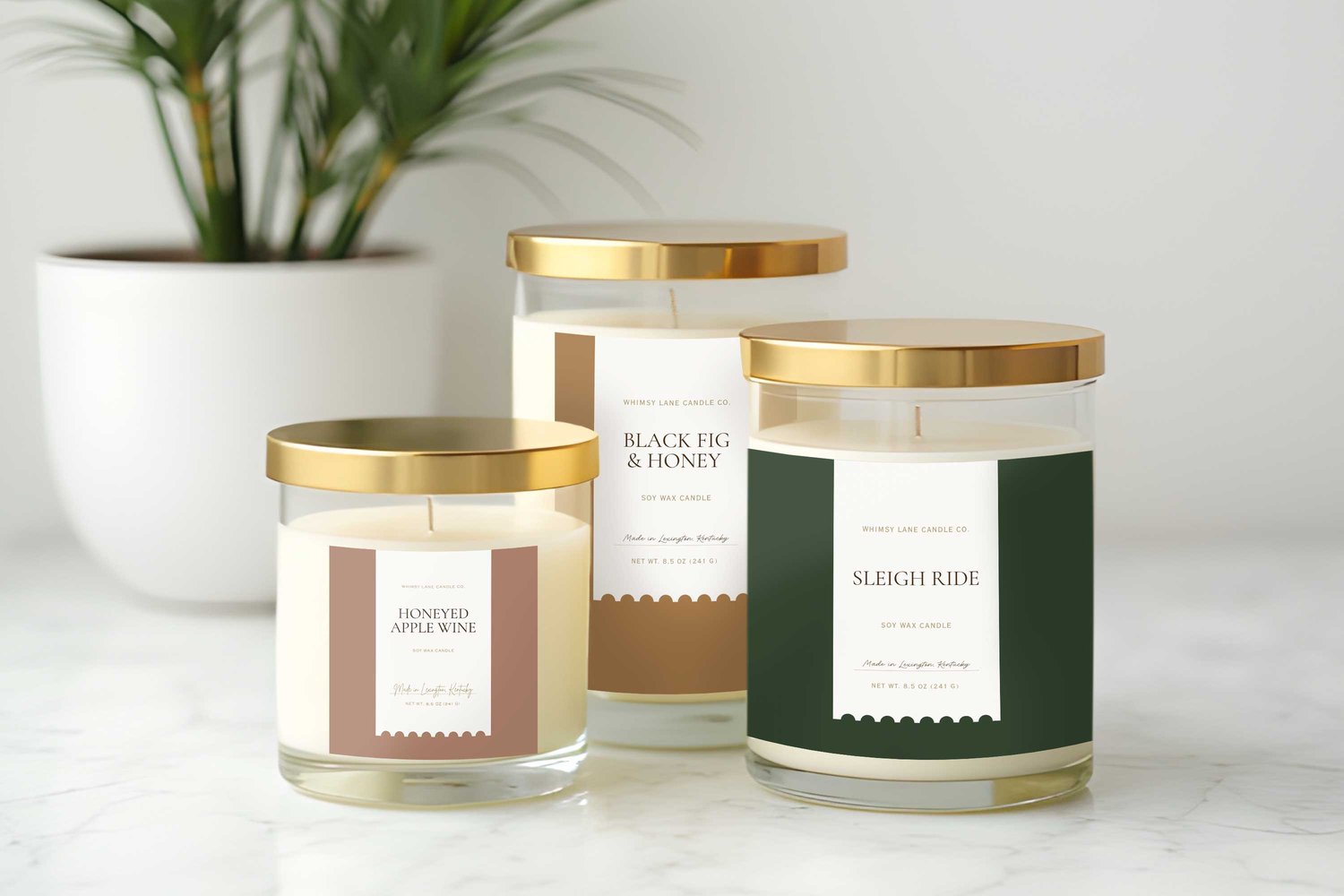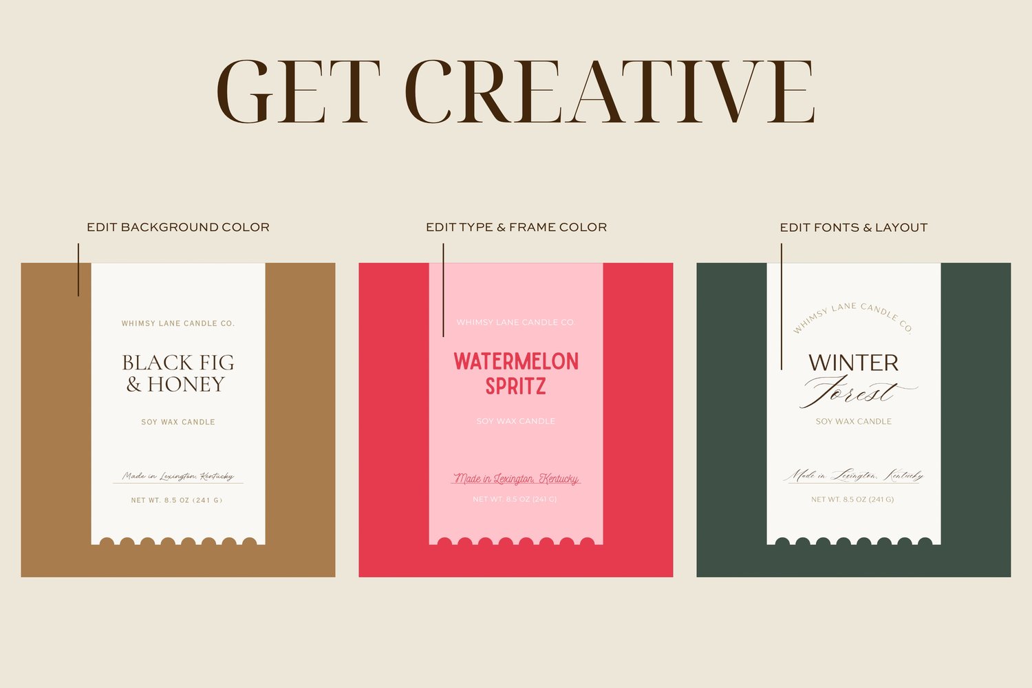 Editable and printable candle product label template featuring a clean and modern customizable layout that will make your candles stand out in the crowd. You can easily edit the label templates in a free Canva account, and give your beautiful and unique products the packaging they deserve.