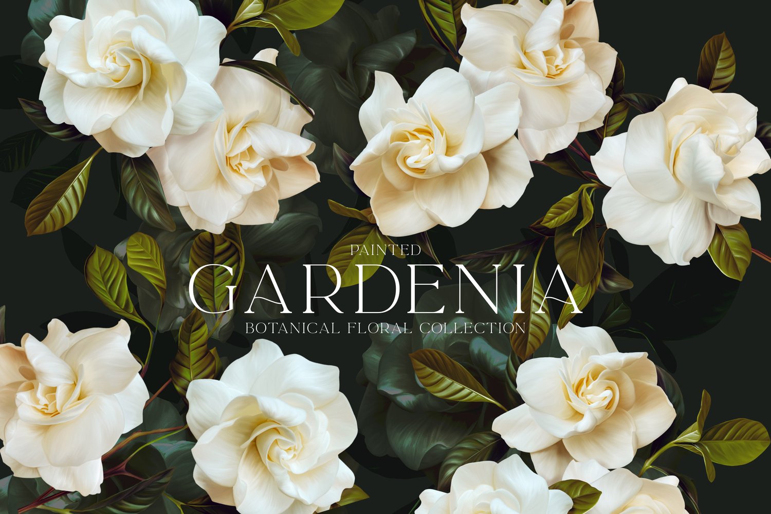 Painted Gardenia Botanical Floral Collection includes a variety of digitally painted lush and vibrant gardenia flowers and leaves. Included are floral arrangements, borders, frames, and several patterns.