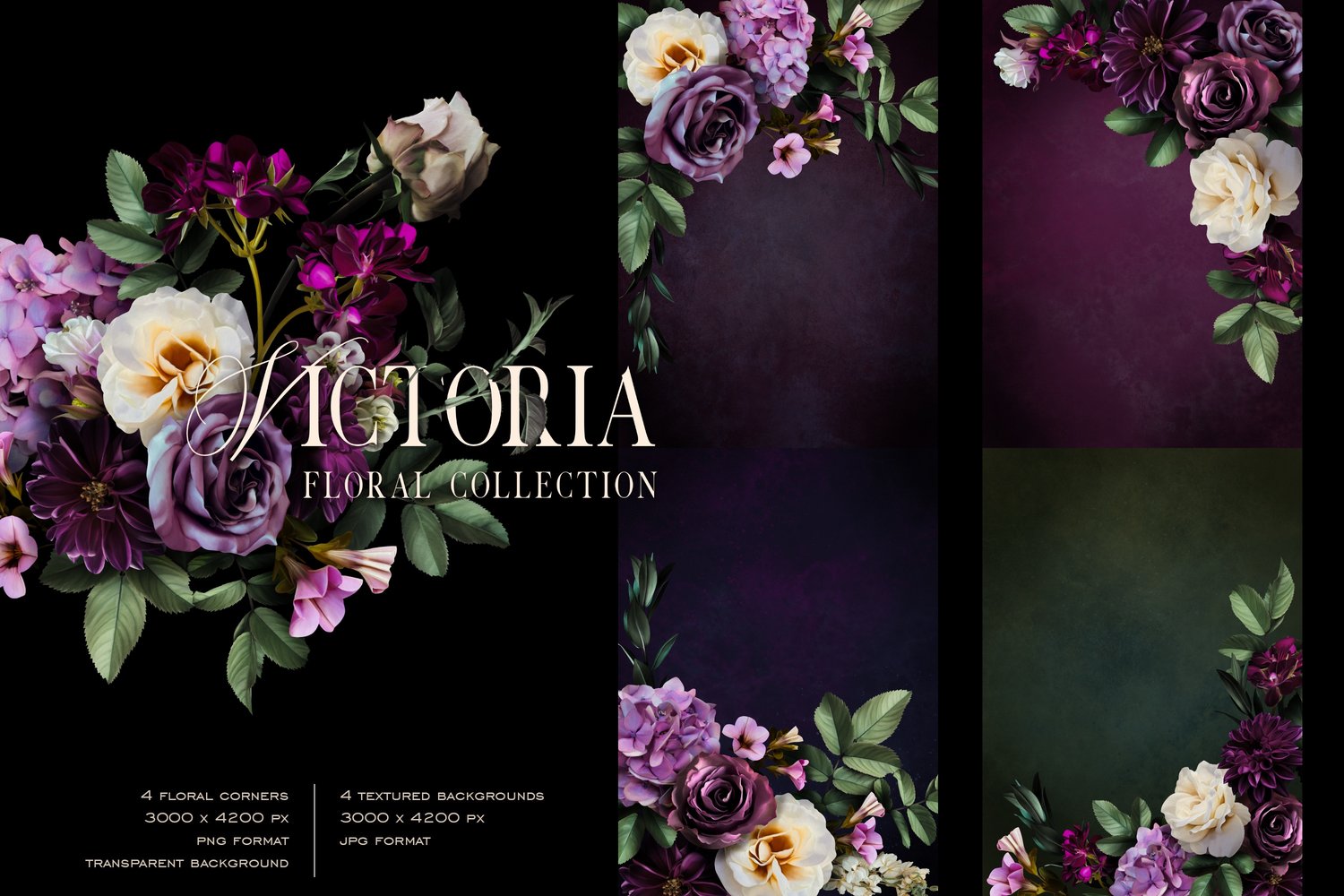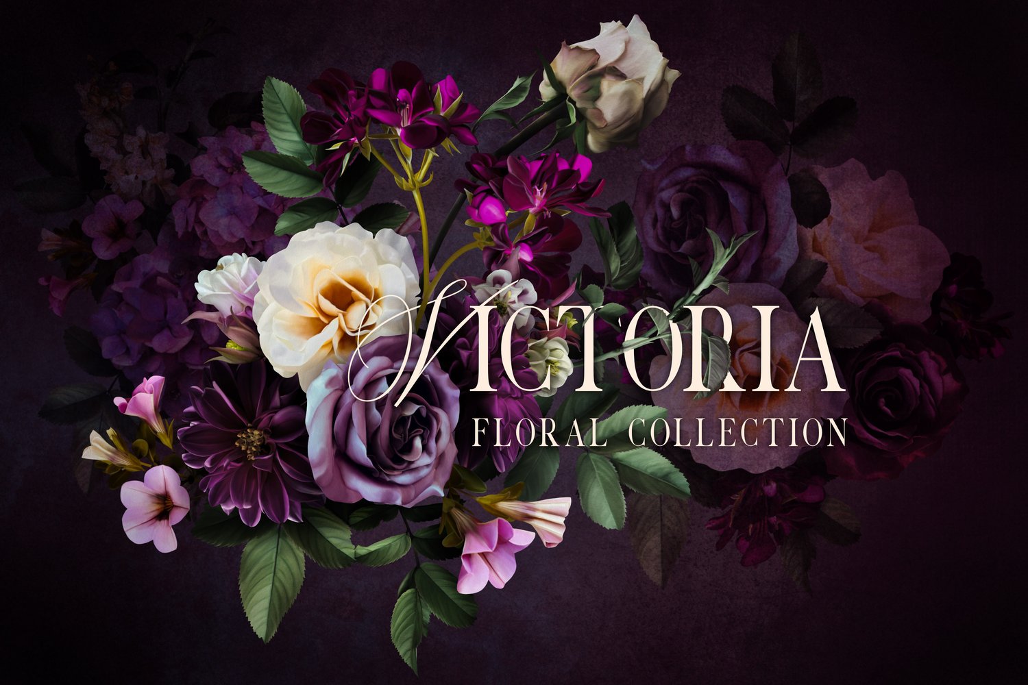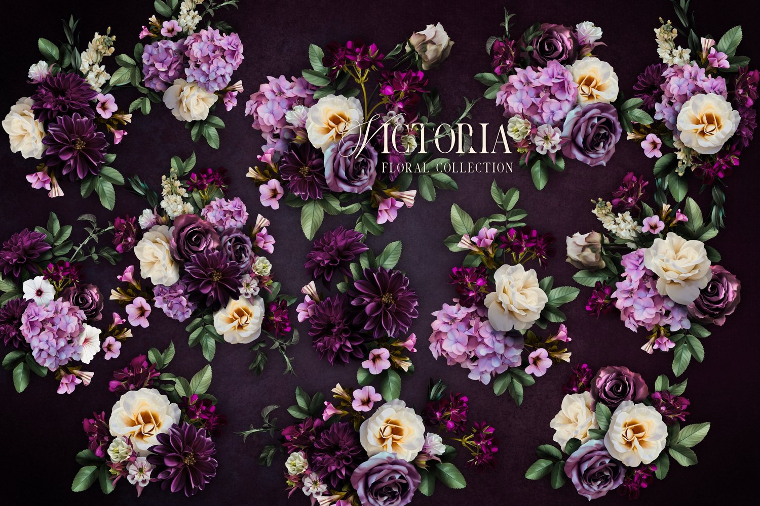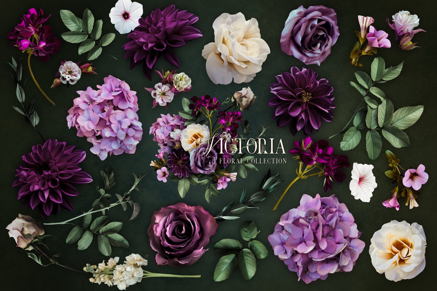 There's something so regal about the color purple, which is why I chose to name this collection Victoria. Each of these flowers is painstakingly hand-painted in Procreate based on my own flower photography, and the colors are glorious. Deep purple, violet, lavender, pink, and cream roses, hydrangea, dahlia, geranium, and more. They will add depth and romance to any design.